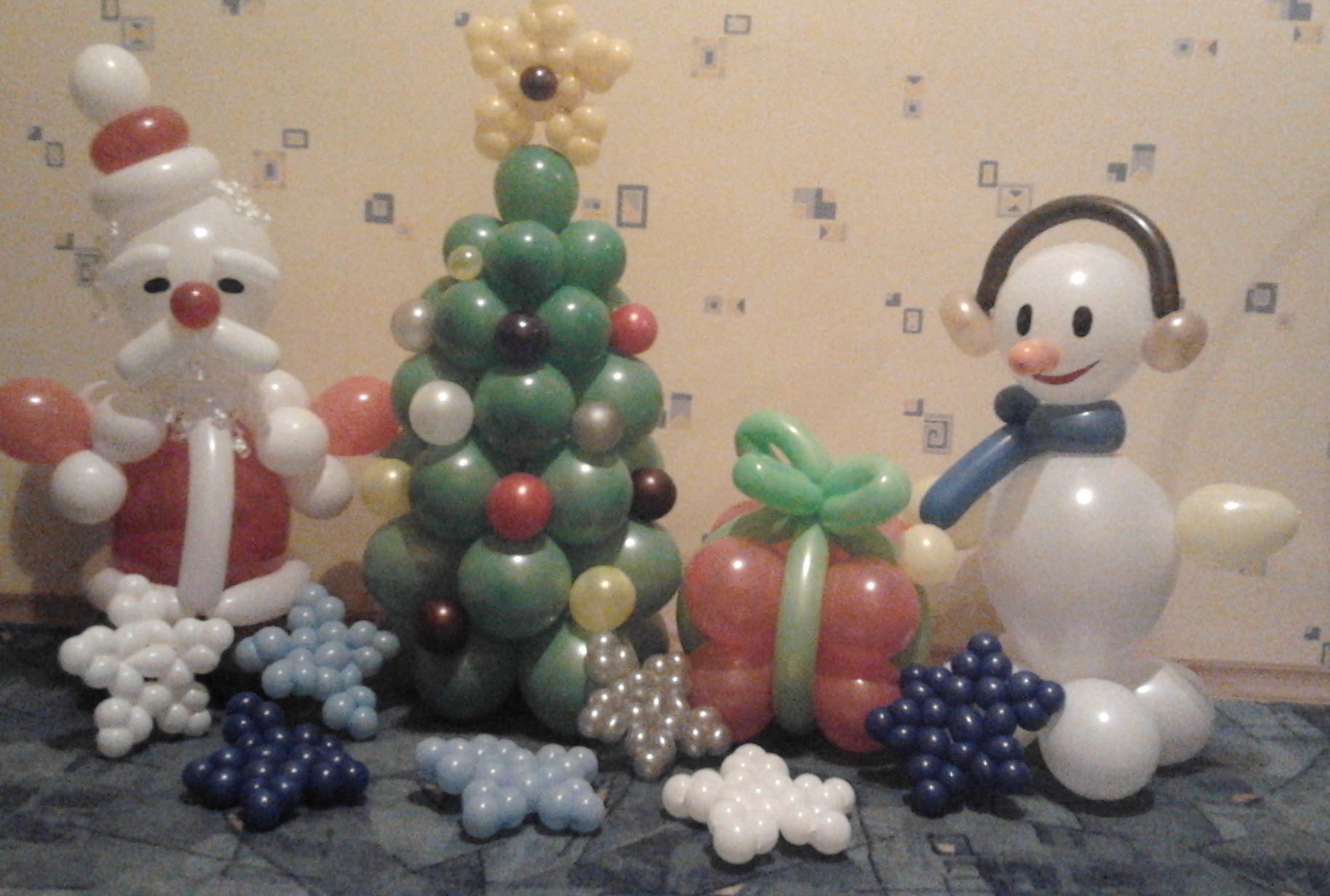 Снежинка делается из одного шарика, надуваете его ровно в половину и далее крутите 4 одинаковых пузыря, 1 пузырь не трогаете , а 2,3 и 4 скручиваете вместе (получается как раз одна грань, далее еще один пузырь пропускаете, а три следующих перекручиваете, получилась следующая грань и так 5 раз., затем самый первый пузырь соединяем с 5 гранью, а остаток шарика от 5 грани соединяем с любой другой гранью, это как раз сама серединка снежинки. надеюсь, что понятно описала процесс, но если что, то спрашивайте.