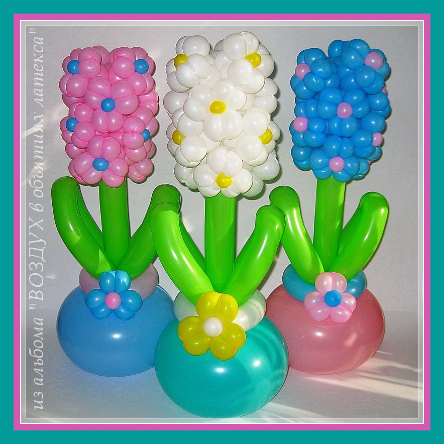 СПАСИБО :) На счёт как делать - я училась методом проб и ошибок сама, смотря на фото такого цветка в инете. Про горшочек всё вроде понятно (есть мастер-класс), а вот само соцветие... Попробую пояснить. Соцветие состоит из 4 троек, которые потом собираются в шахматном порядке. Крепила их между собой при помощи ШДМ такого-же цвета, как и сам цветок. Цветок делается из 9 пузырьков: 6 пузырьков на лепестки (получается по 2 пузырька на 1 лепесток) и 3 пузырька на бутон. На предыдущем фото (справа внизу) хорошо виден сам цветок. Я думаю как его делать более или менее понятно. Так вот, в 1 соцветии таких цветков - 3 штуки, т. е. если из 1 ШДМ 260 накрутить 27 пузырьков, то можно наплести 3 цветка сразу. У меня так не получилось (шарики джимаровские короткие, да и опыта всего 2 месяца) и мне пришлось из 2 шариков делать 1 соцветие (2 цветка из одного шара и 1 из другого). Вот как-то так :)
